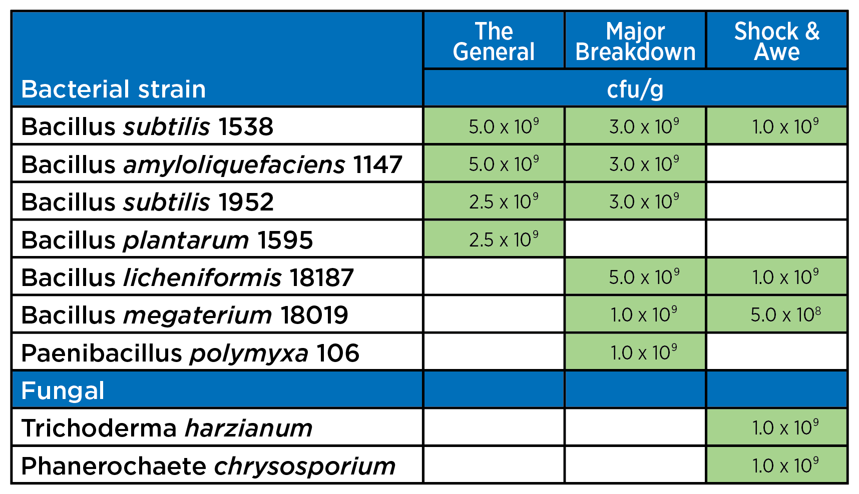 Shock and Awe combines the power of both bacteria and fungi in a single microbial blend at 3 billion CFU per gram. Trichoderma harzianum and Phanereochaete chrysosporium bring aggressive fungal decomposition of lignin and cellulose, while three proven Bacillus strains drive nutrient cycling and support root zone health. Shock and Awe hits the soil from multiple angles so nothing gets left behind. Mixed product must be applied within 24 hours.